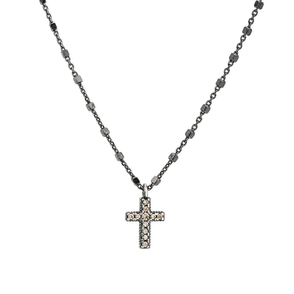Versátil y súper combinable, así es el collar Plata Cruz Pequeña. Una cadena de plata con baño de rutenio de la que cuelga una cruz de 9x7mm llena de circonitas engastadas que te atrapará por su luz y carisma.