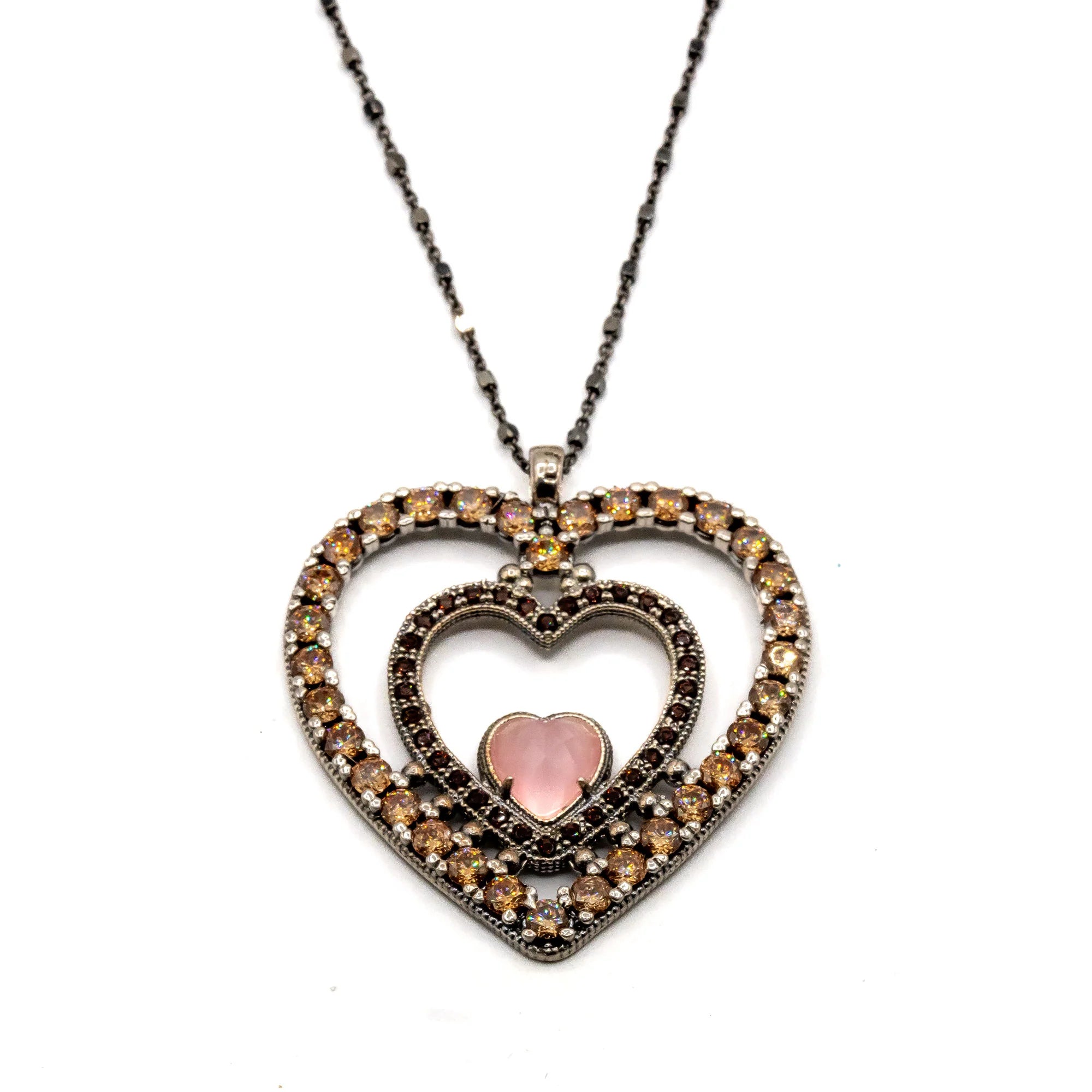 Divertido y muy romántico. Así es este colgante XL. Una cadena de plata con baño de rutenio de la que cuelgan dos siluetas de corazón repletas de circonitas y una piedra semipreciosa en forma de corazón de 10mm en el centro como protagonista.