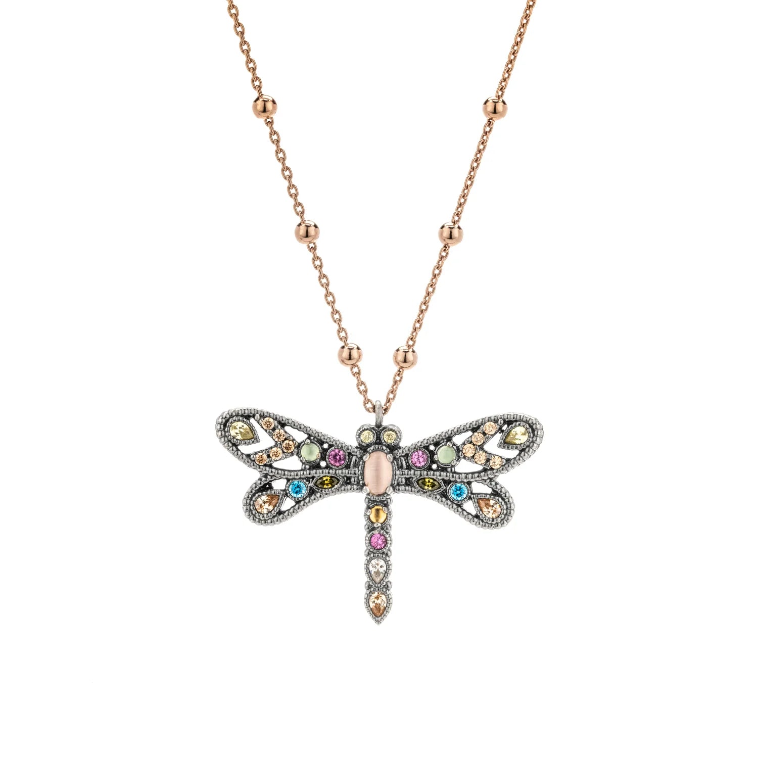 Colgante mediano de plata Libélula. Engastado con piedras semipreciosas. Piedra central ojo de gato rosa, cola citrino, circonitas rosa, blanca y cava. Alas circonitas verde claro, oscuro, cava, blanca, rosa, azul.