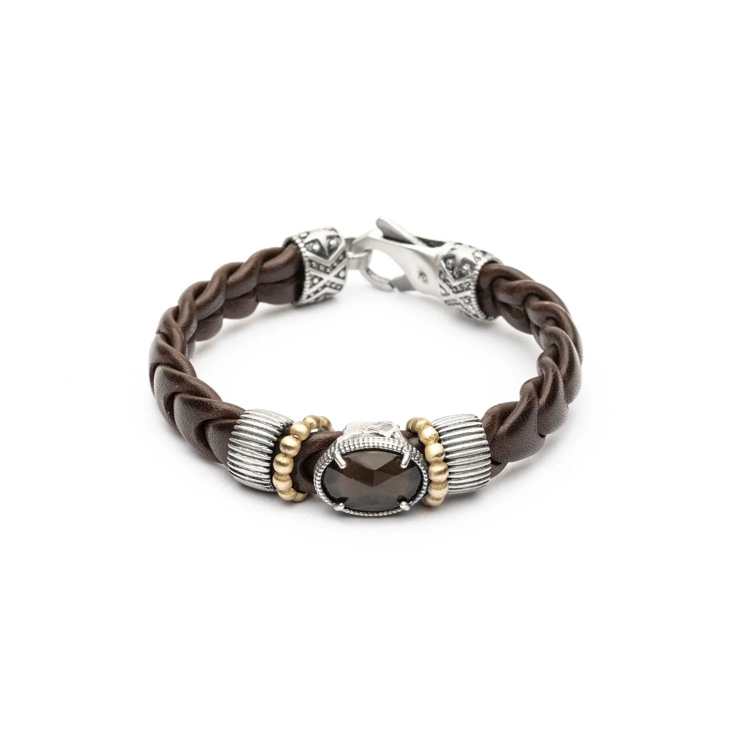 Más que joyas, símbolos de carácter. Así nace ICON: Joyas para él y para ella. Una pulsera de cuero marrón trenzado de 10mm con una piedra semipreciosa fumé ovalada en el centro como protagonista y entrepiezas de plata y bronce que le dan un toque único.