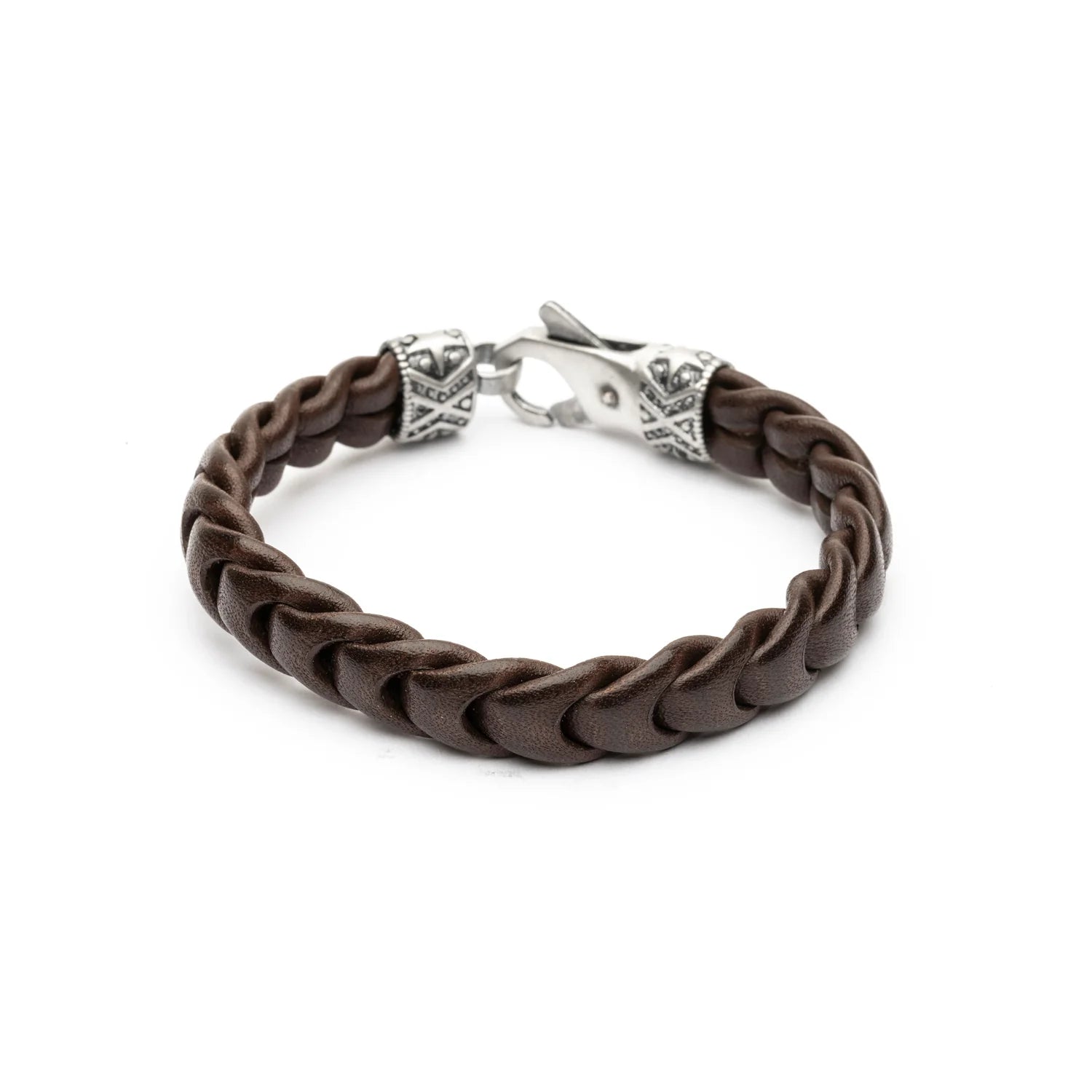 Más que joyas, símbolos de carácter. Así nace ICON: Joyas para él y para ella. Una pulsera de cuero marrón trenzado de 10mm que no necesita nada más para brillar. Los detalles de plata del cierre te atraparán. Una pieza atrevida y perfecta para combinar y elevar cualquier look.