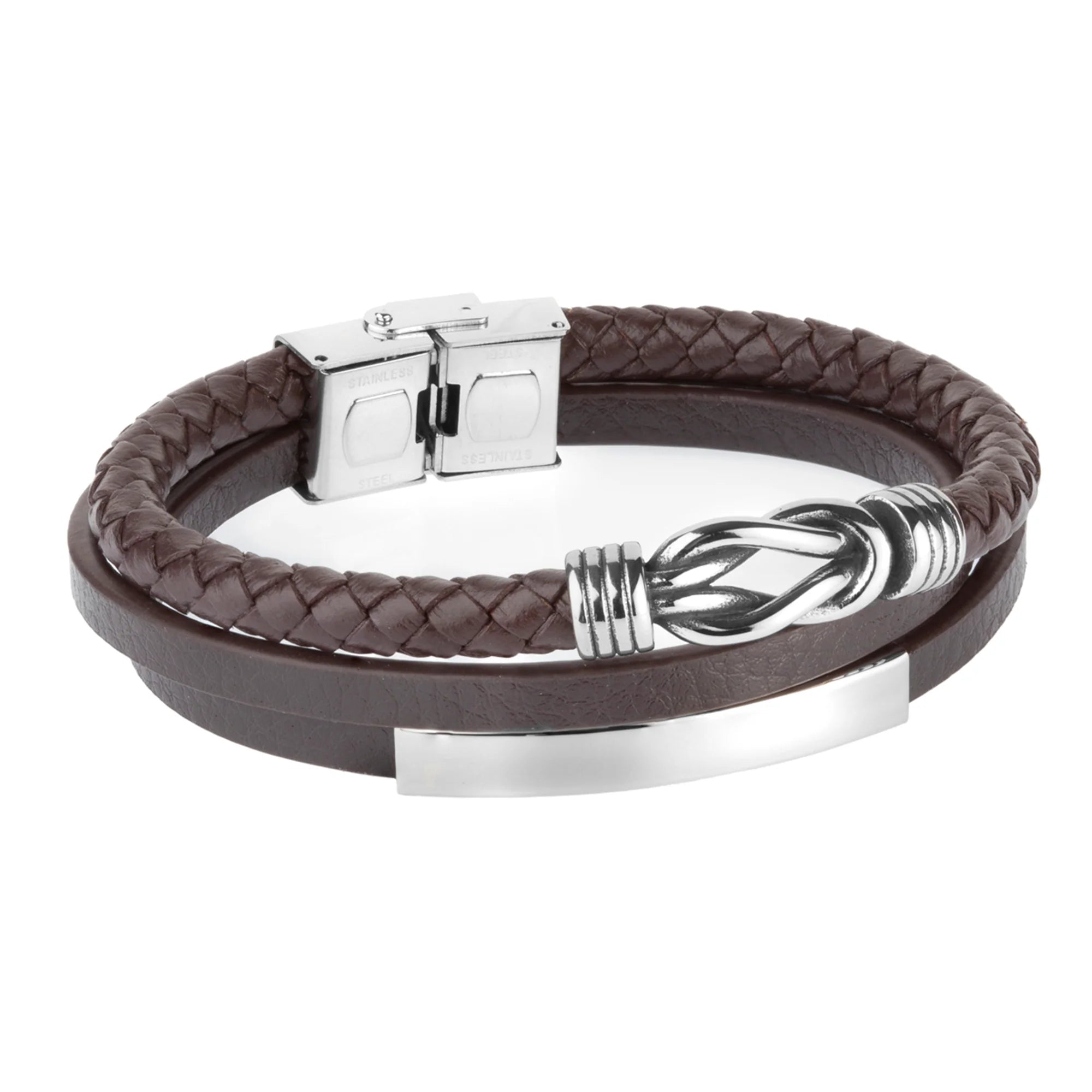 Pulsera de hombre triple piel con placa y nudo en acero