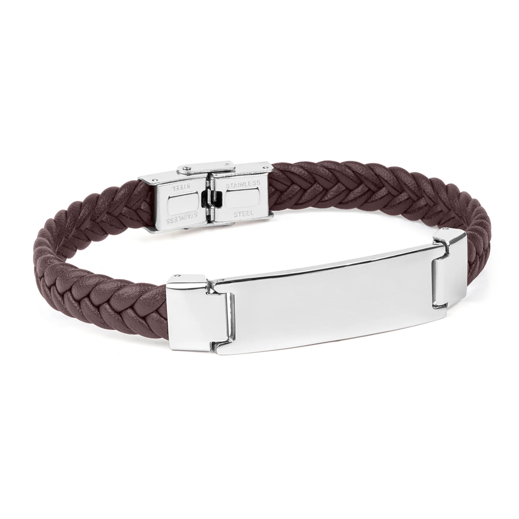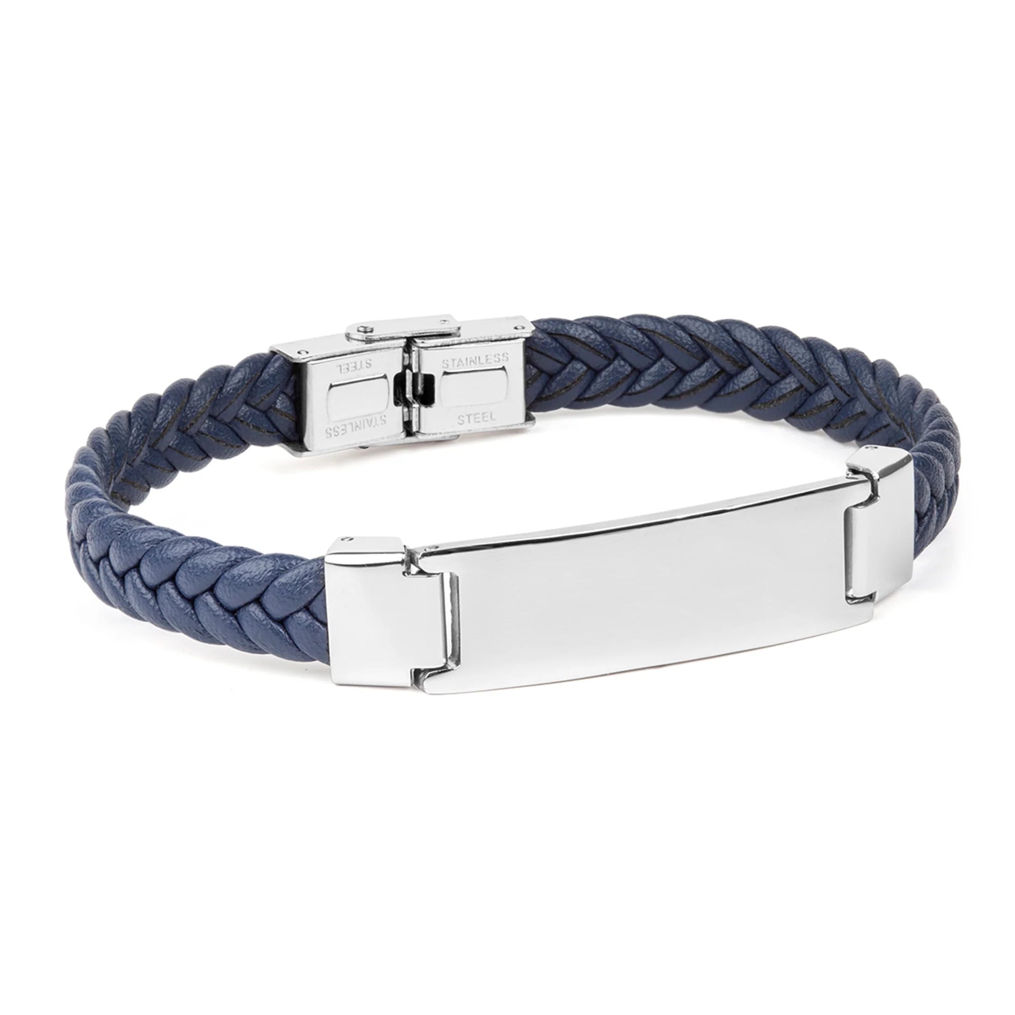 Pulsera masculina con un estilo moderno y versátil: piel trenzada en color azul combinada con una placa de acero, ideal como accesorio diario o complemento urbano con un toque de elegancia.