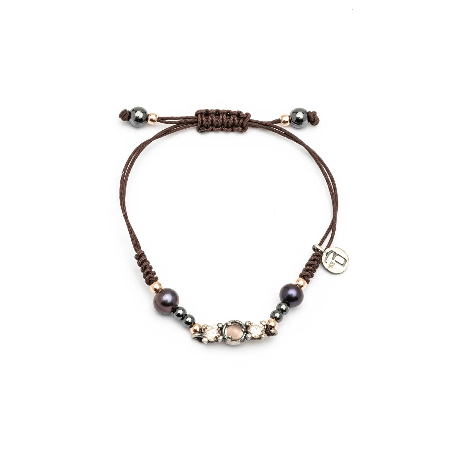Esta pulsera emana los misterios de la noche: Tan tentadores como vibrantes. Una pulsera de macramé con bolas de plata bañada en oro rosa de 3mm con una piedra semipreciosa hexagonal de 6x10mm con orla de circonitas que te atrapará.