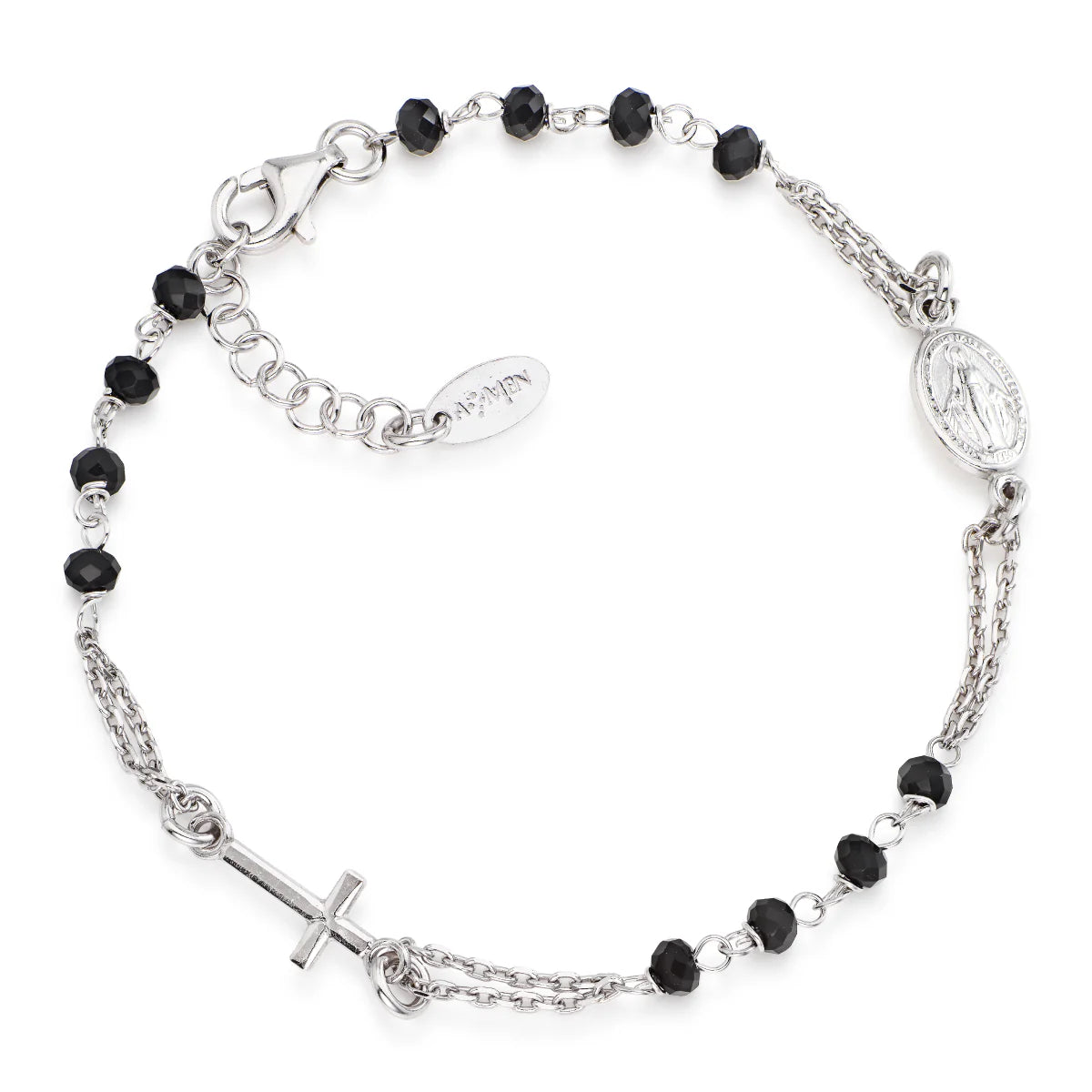 Pulsera Rosario de plata de ley bañada en rodio con cristales negros multifacéticos de 3 mm, con cruz y medalla de María Milagrosa. La longitud de la pulsera se puede ajustar de 18 a 20 cm con cierre y eslabones de cadena de extensión.