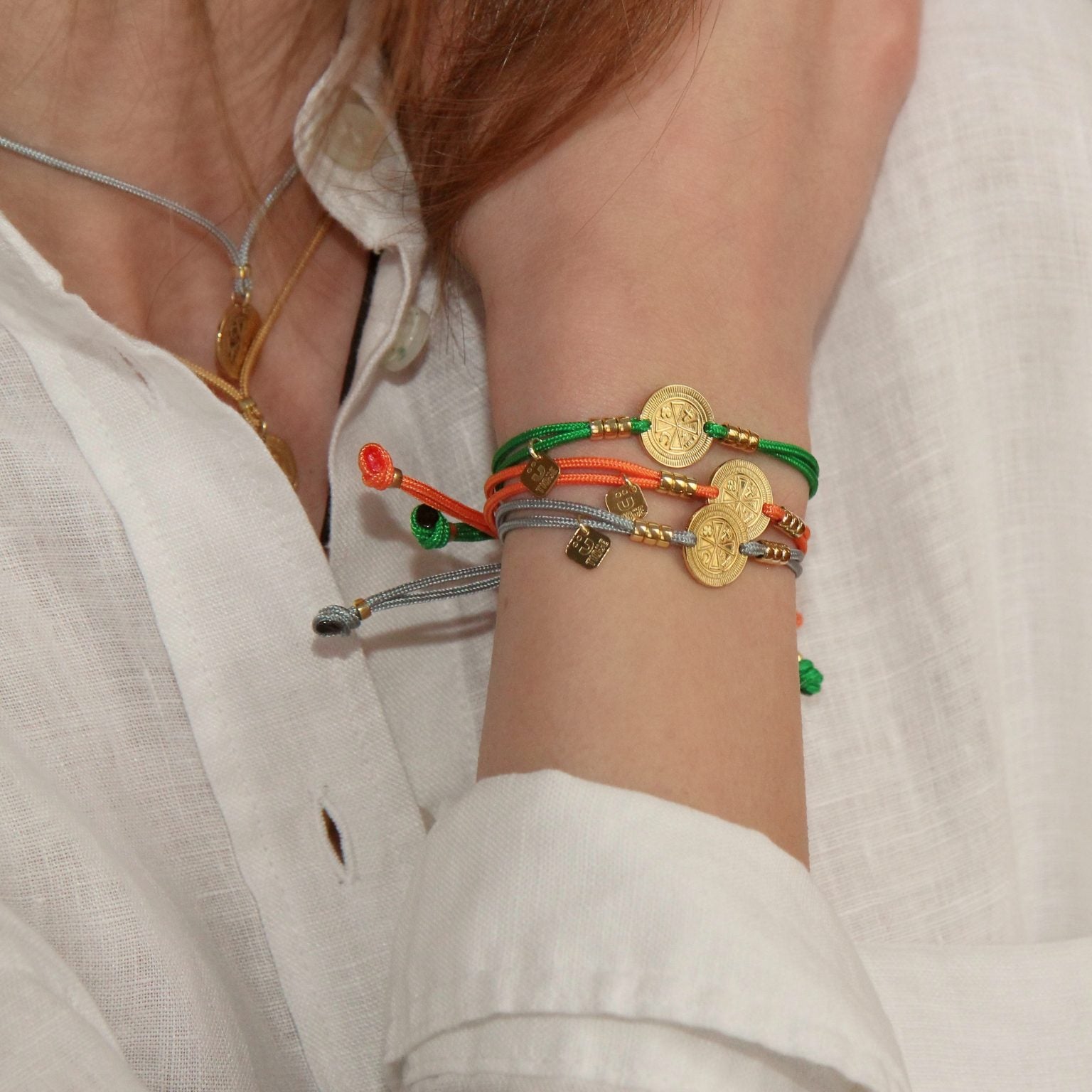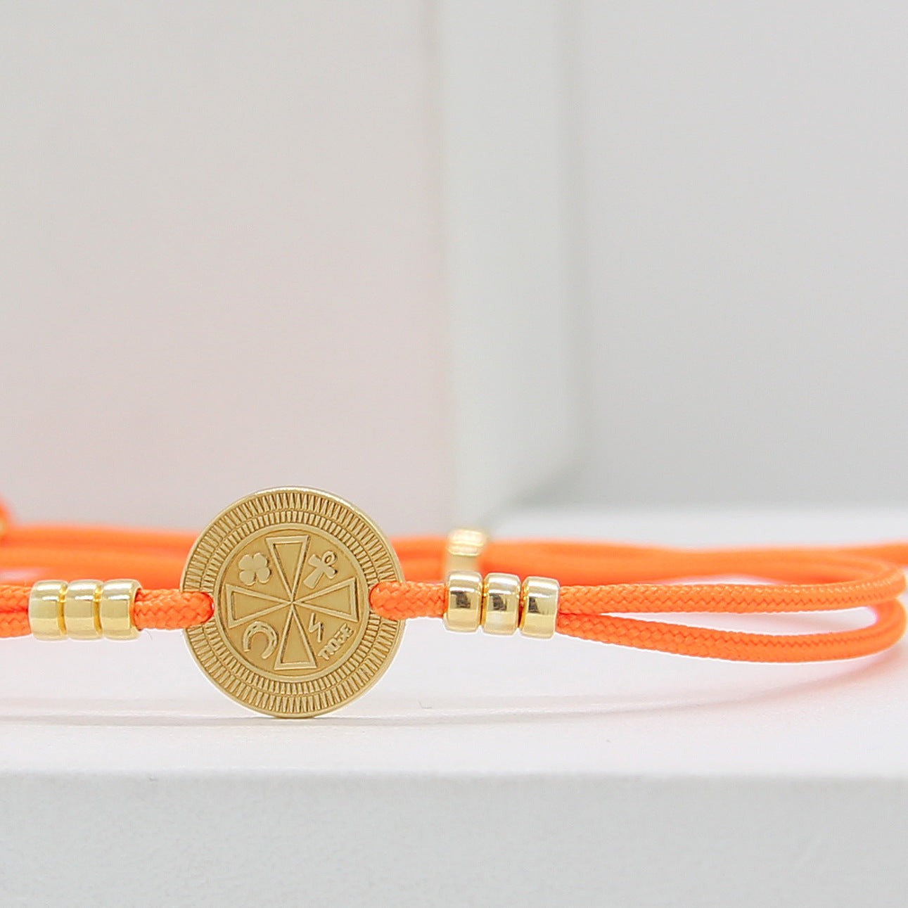 Pulsera con medalla Talisman de plata chapada en oro de 24kt. de 13mm de diámetro y cordón en seda-nylon de alta resistencia.
