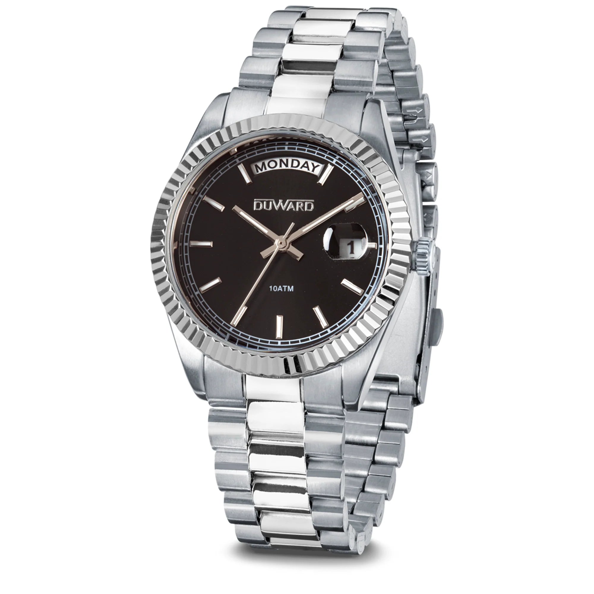 Descubre la elegancia atemporal de este reloj para mujer DUWARD, diseñado en acero realzan tu estilo. Su esfera negra y bisel estriado le confieren un toque sofisticado, mientras que la resistencia de 10 Atm garantiza durabilidad en tu día a día. Equipado con calendario y semanario, combina funcionalidad práctica con un diseño cautivador que complementa cualquier ocasión.
