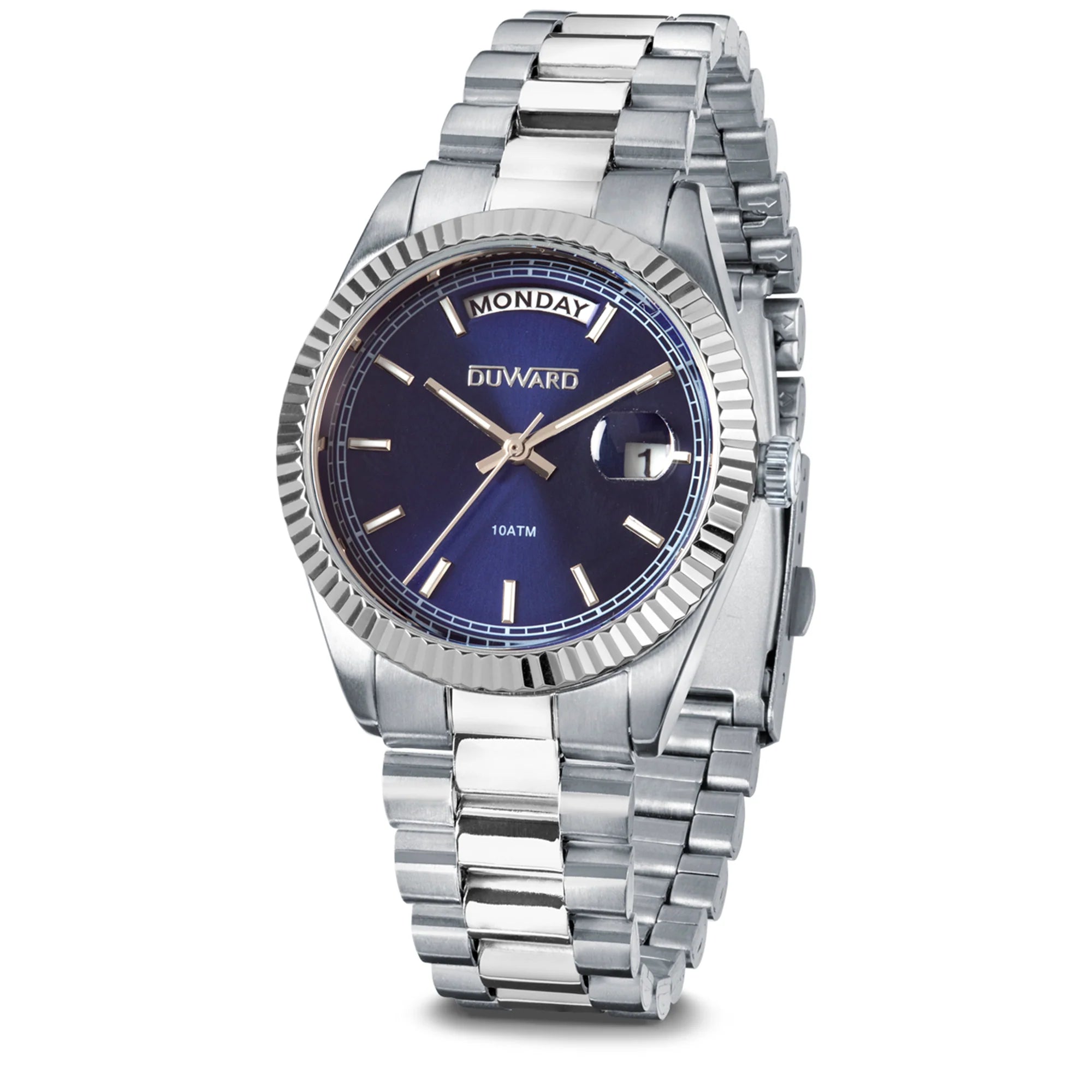 Reloj DUWARD para mujer, diseñado con caja de acero inoxidable que combina durabilidad y sofisticación. Su esfera azul destaca con una ventana semicircular a las 12 horas que muestra el día de la semana, y el calendario en la posición de las 3 horas. Protegido por un cristal mineral acabado zafiro resistente a arañazos y una resistencia al agua de 10 ATM, este reloj es tu compañero perfecto para cualquier ocasión, desde el trabajo hasta el fin de semana. Precisión, estilo y funcionalidad en una sola pieza.