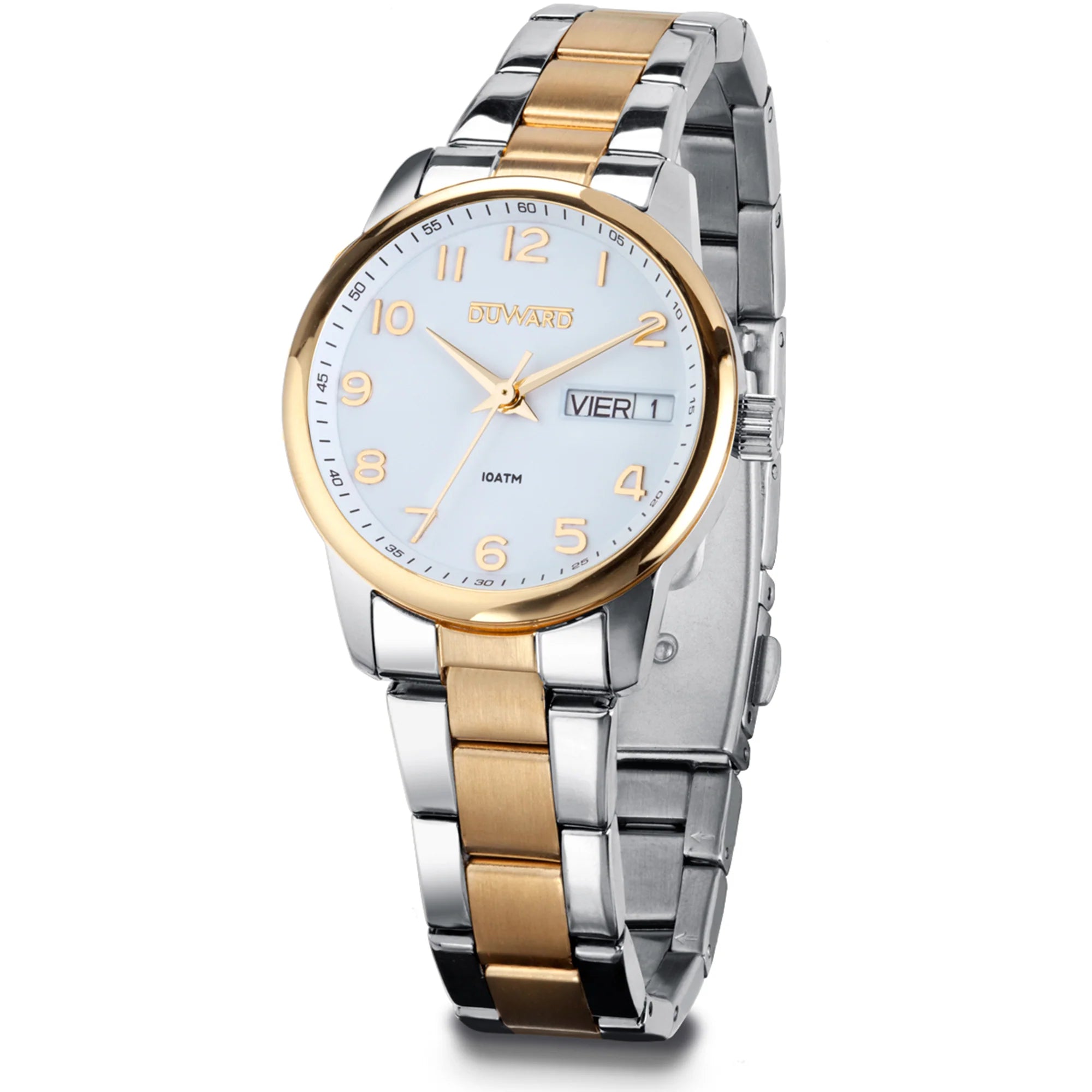 Material de la caja: acero inoxidable · Diámetro de la caja: 31 mm · Grosor: 10,2 mm · Brazalete: acero bicolor IP dorado · Función: doble calendario con números arábigos · Resistencia al agua: 10 ATM (100 m) · Fondo: acero a rosca · Cristal: mineral con acabado tipo zafiro · Cierre: con pulsadores en la pulsera metálica