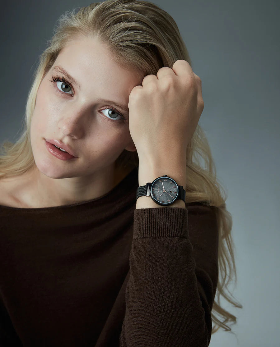Estilo: Elegante Usuario: Mujer Material de Caja: Acero Forma de la caja: Circular Material de Bisel: Acero Material de la Corona: Acero Color principal Esfera: Gris Diámetro: 33 MM Cristal: Mineral Acabado: Ip -negro Tipo de Pulsera: Brazalete Material de la Pulsera: Malla de acero Color de la Pulsera: Negro Tipo de Cierre: Cierre deslizante Dimensión de Correa: 12 - 12 MM Impermeable / Sumergible: Impermeable Profundidad / Protección: 30 metros Tipo de Movimiento: Cuarzo Analógico